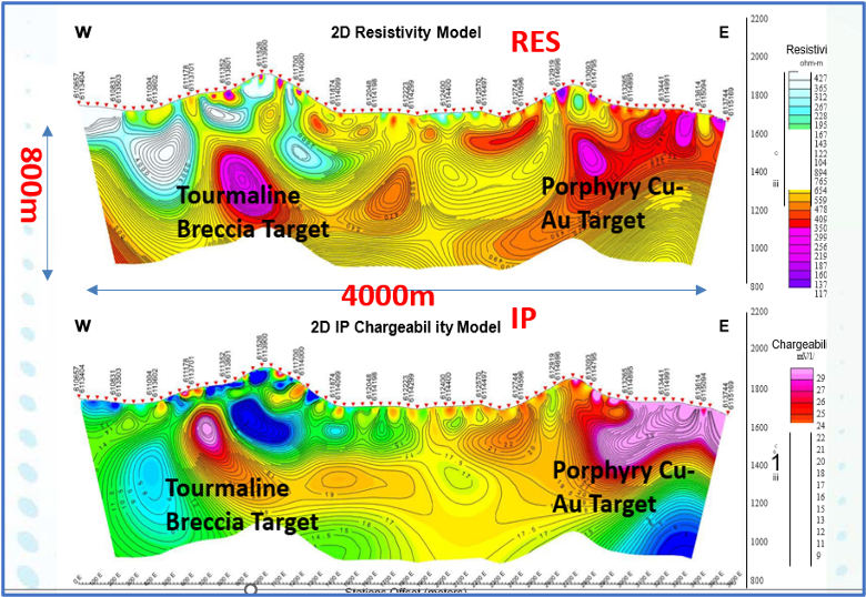 Above we see a double targeting result on a single Alpha IP™ survey investment by this explorer. Two targets were distinguished in a single line of 2D work, including a tourmaline breccia to the west and a porphyry Cu Au target to the east. Depth shown in 800 m; results have been truncated below 800 m but, in fact, extend to 1000+ m in depth. Courtesy of Jaxon Mining Inc.